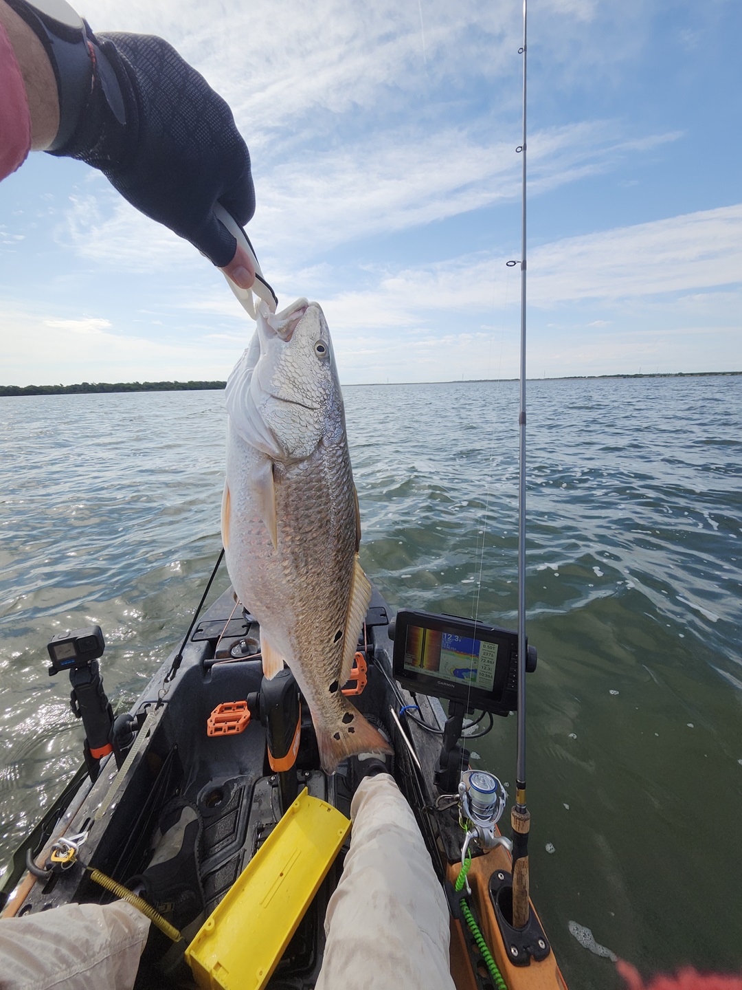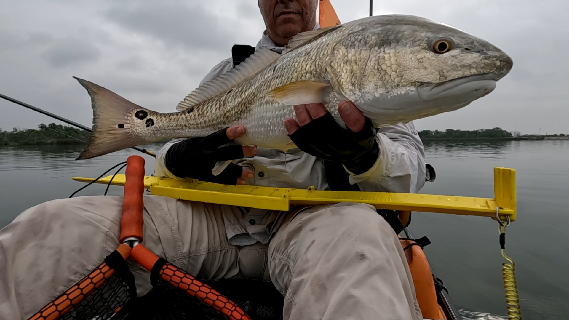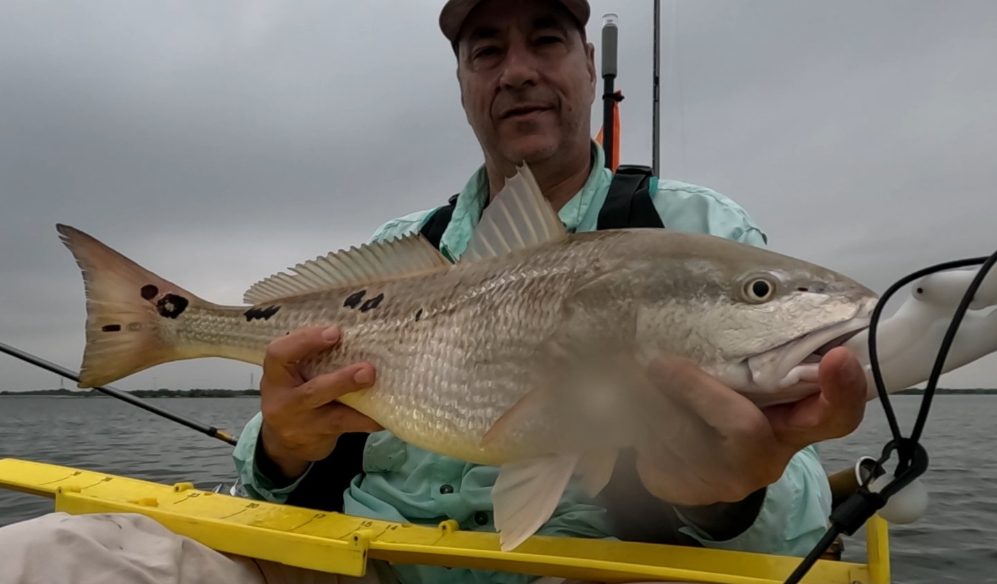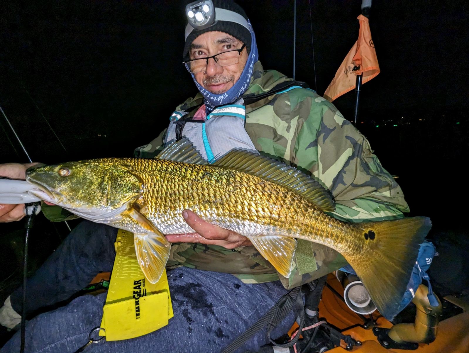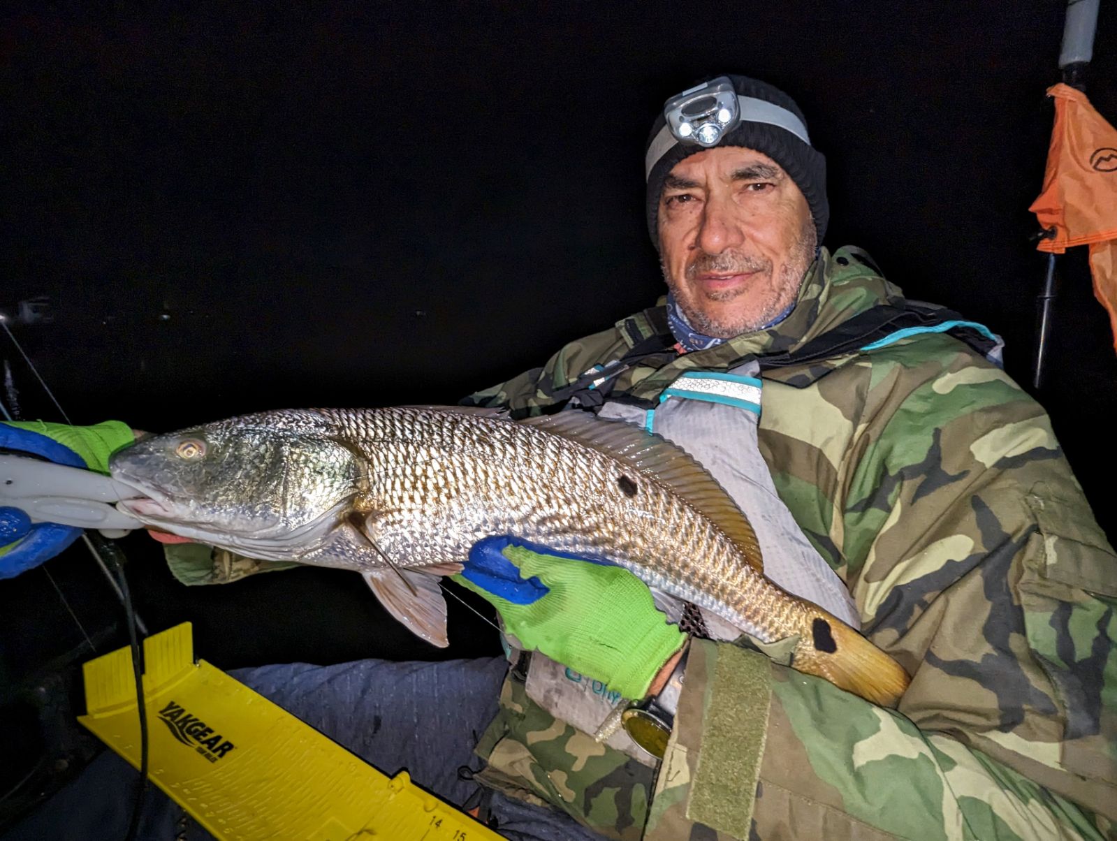 Largest redfish of the night caught kayak fishing at night on the way back; last outing of the trip.